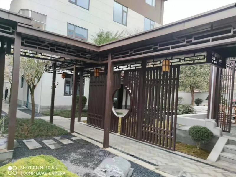 • 新中式仿古廊架:格栅、花格、月亮门,古典韵味。